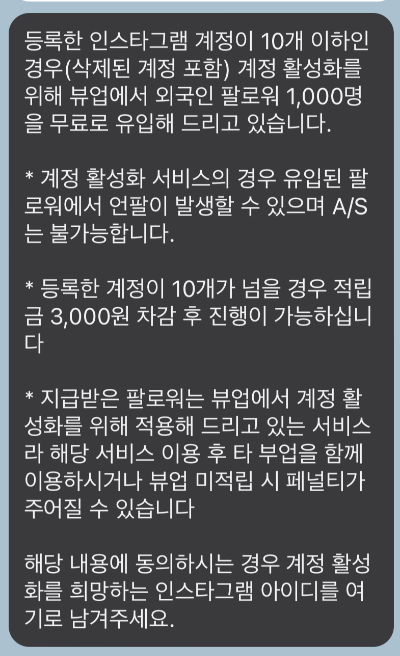 뷰어 고객센터에 요청할 경우 해당 인스타그램 계정에 외국인 팔로워 1000명을 무료로 유입해주는 서비스를 제공하고 있습니다. 저 같은 경우도 고객센터에 서비스 요청 후 저녁 6~7시 사이에 1000명 가까이 되는 팔로워들이 유입이 되어 계정 승인이 다시 재개되었습니다.