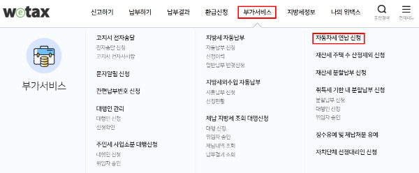 위택스 홈페이지 ▶ 부가서비스 ▶ 자동차세 연납신청
