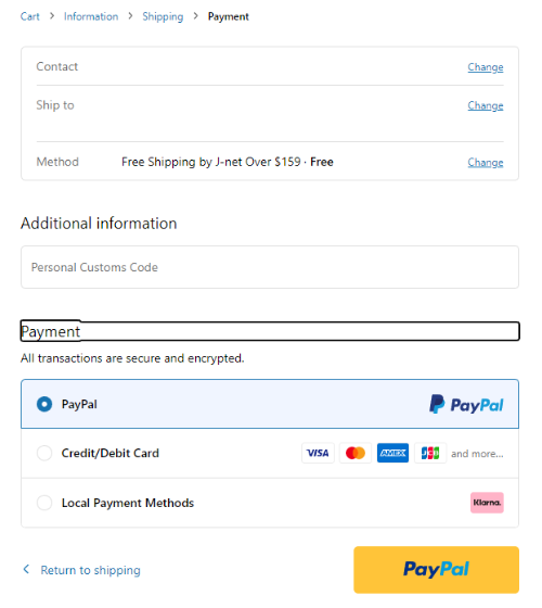 배송정보를 전부 작성하고 나면 배송방법을 선택할 수 있습니다. 현재 한시적으로 159$ 이상 구매 시에는 무료배송 이벤트 중이니 이 기회를 놓치지 않는 게 좋습니다! J-net을 통한 배송은 보통 2주 정도 소용됩니다.